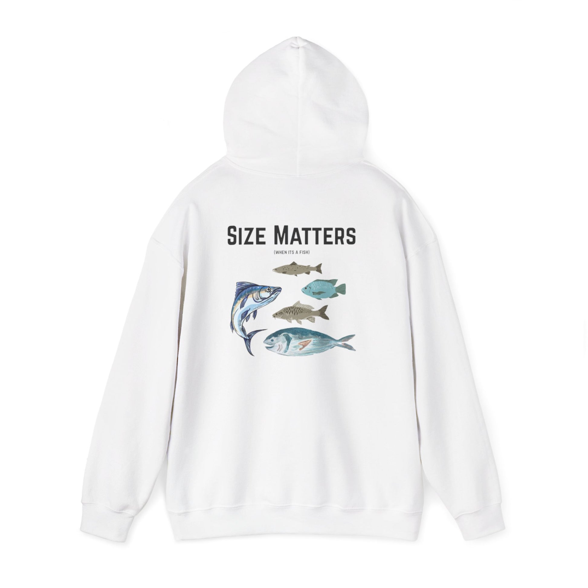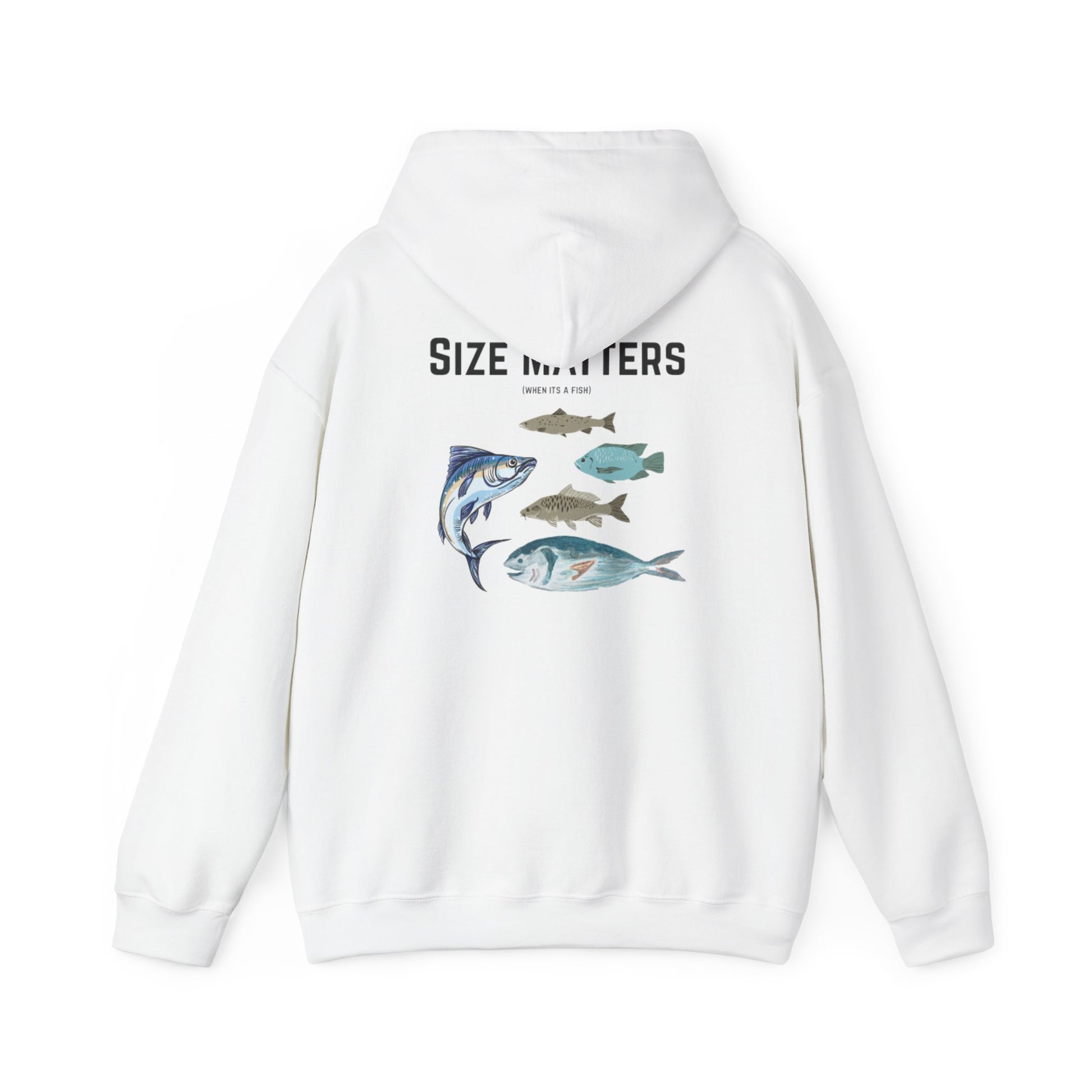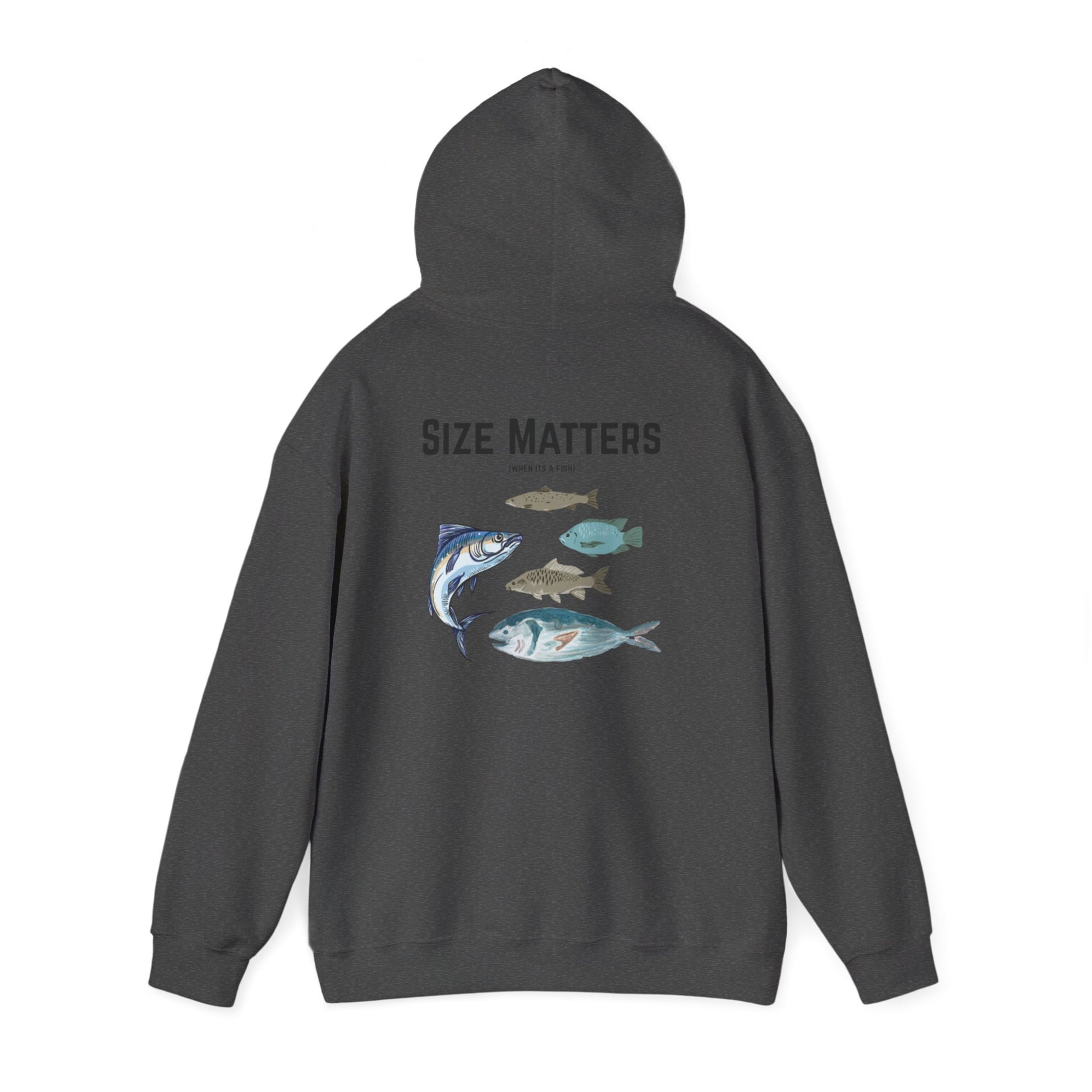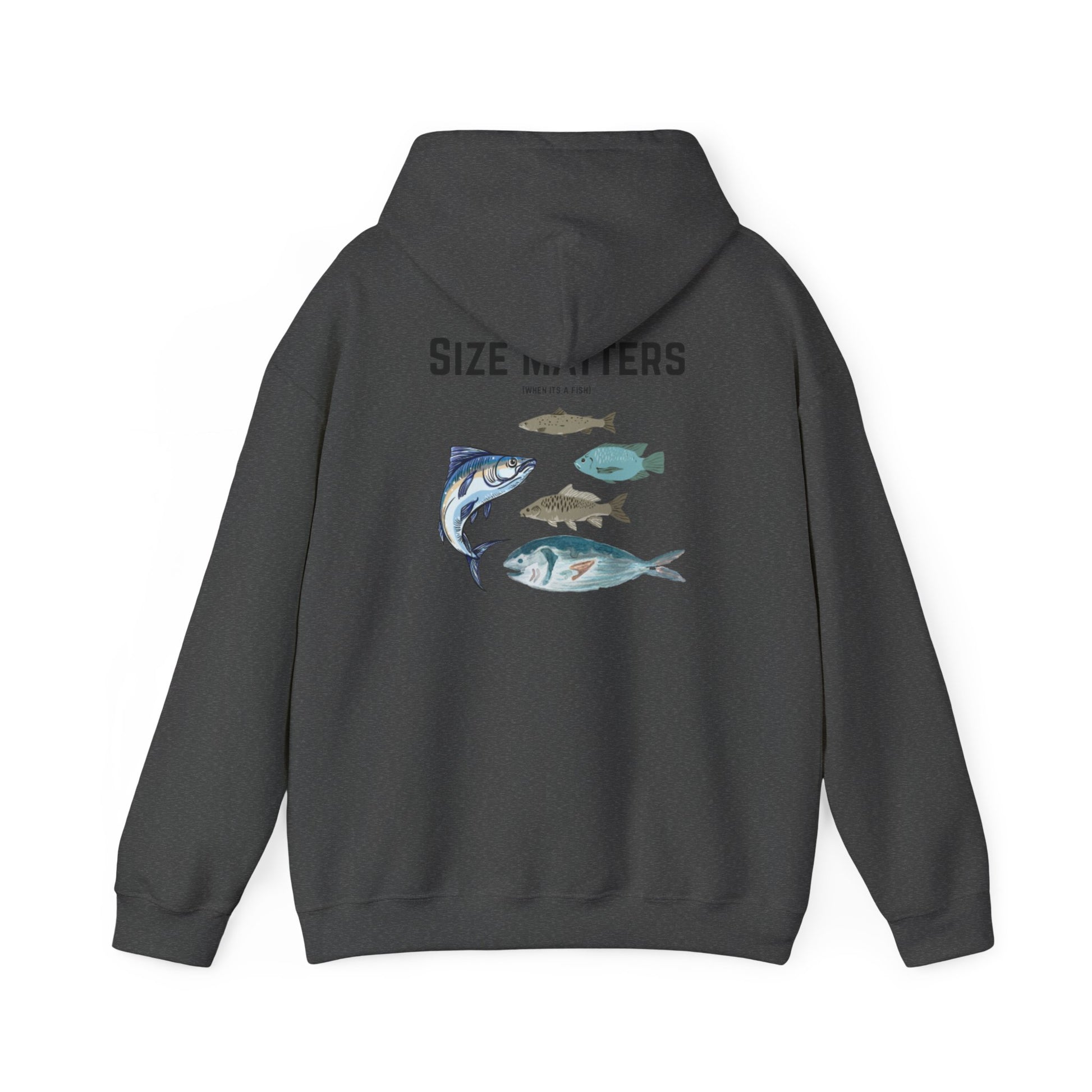 Stay warm and cozy in this Unisex Heavy Blend Hoodie featuring a humorous 'size matters (when it's a fish)' design. Perfect for those who love fishing and appreciate a good laugh. Ideal for casual wear or lounging around the house. Great for gifting during holidays, birthdays, or as a treat for yourself.